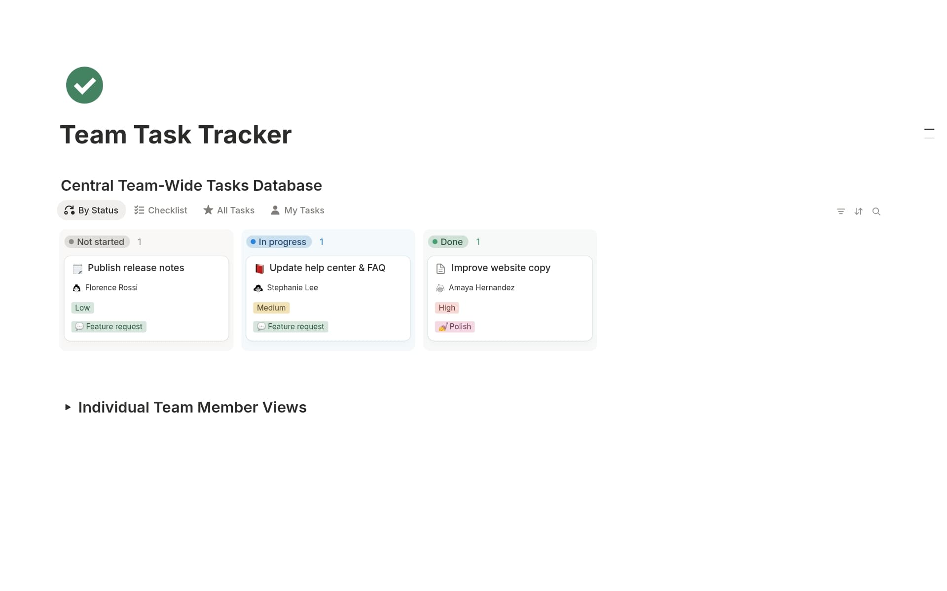 Task Statuses: Look for templates that allow you to customize task statuses (e.g., To Do, In Progress, Done) to reflect your team's workflow accurately.